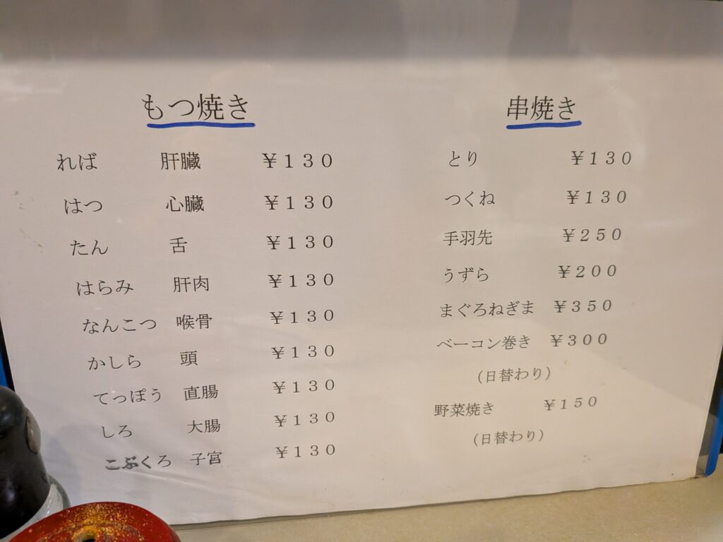 焼鳥、もつ130円…。土地柄を考えると一般的に高値なのですが、安いんですYO!