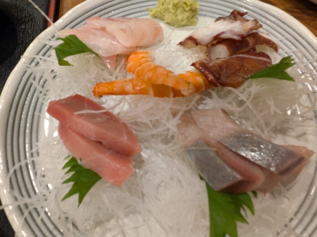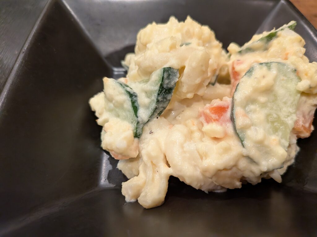 刺し盛り1300円!そしてお通しはポテサラ!(^^)!真澄さんのポテサラは、きゅうりやにんじんなどの王道系。たまご入りでまったりクリーミー、うまいんですYO!