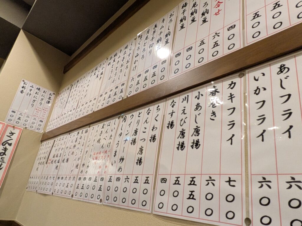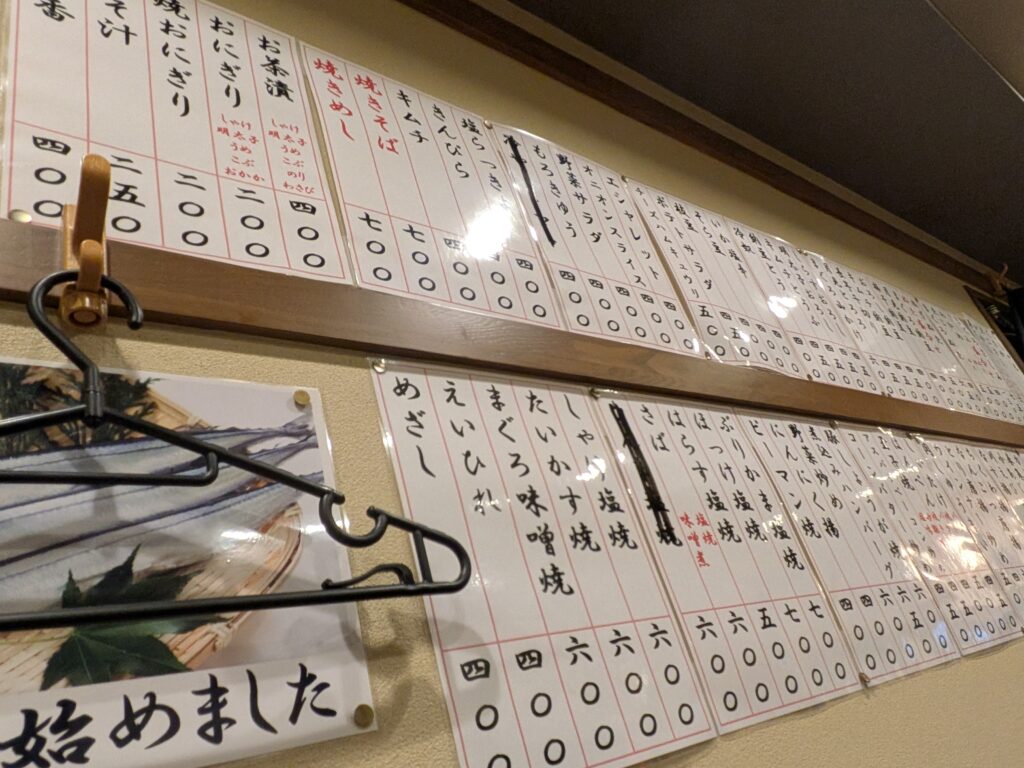 料理は壁の短冊をチェックです。刺身、揚げ物、煮物、締めのご飯まで200円~、400円台中心のリーズナブルさ。