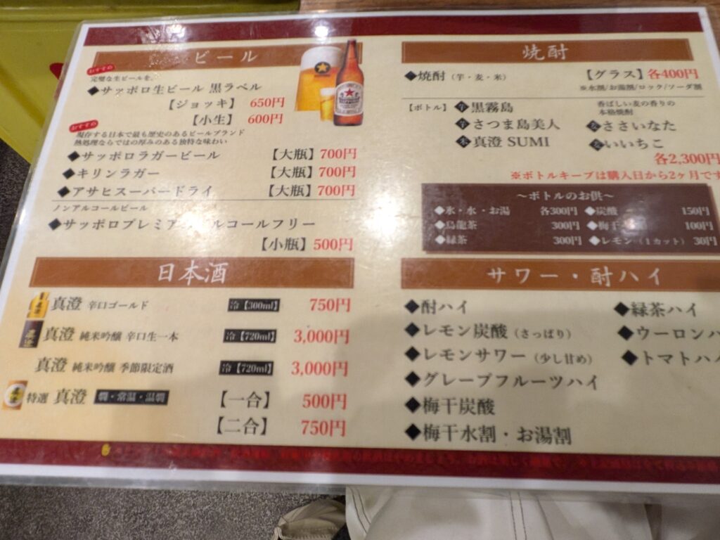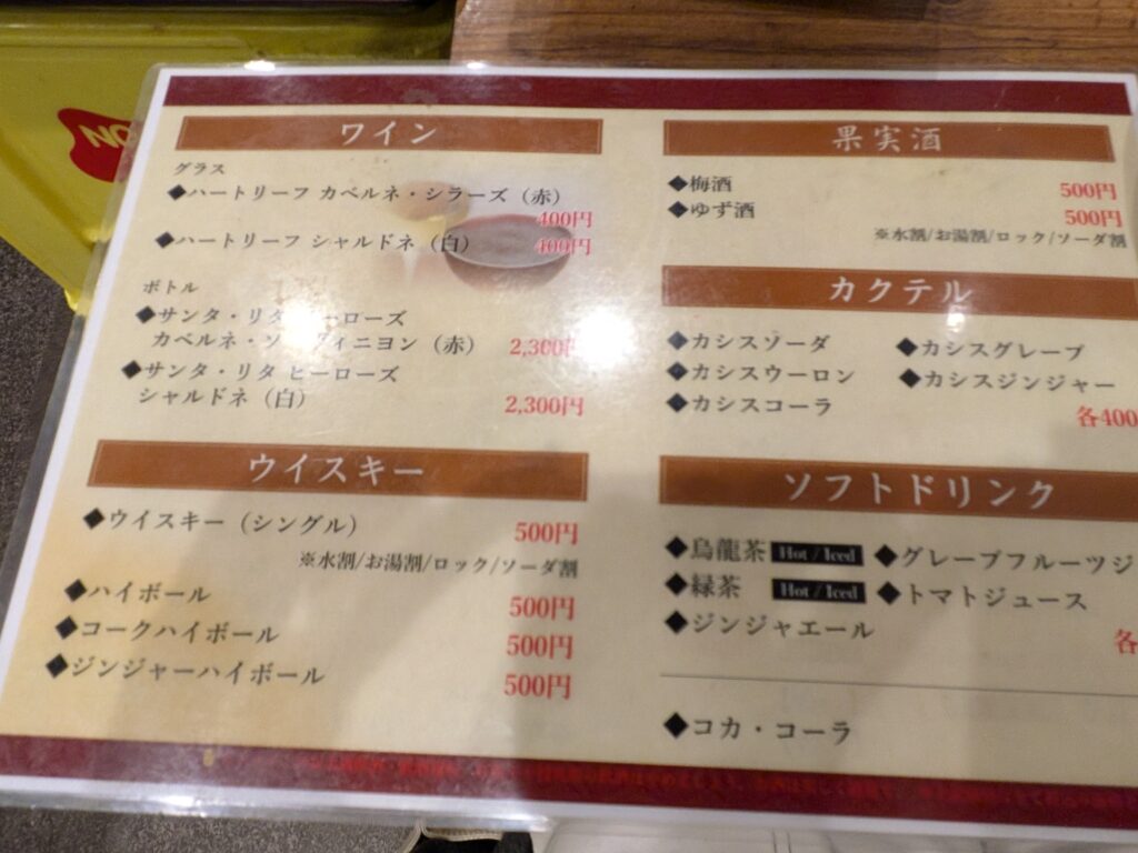 ちなみにお酒はメニュー表あり!焼酎400円、酎ハイ400円、日本酒、ワインなどなどラインアップ。