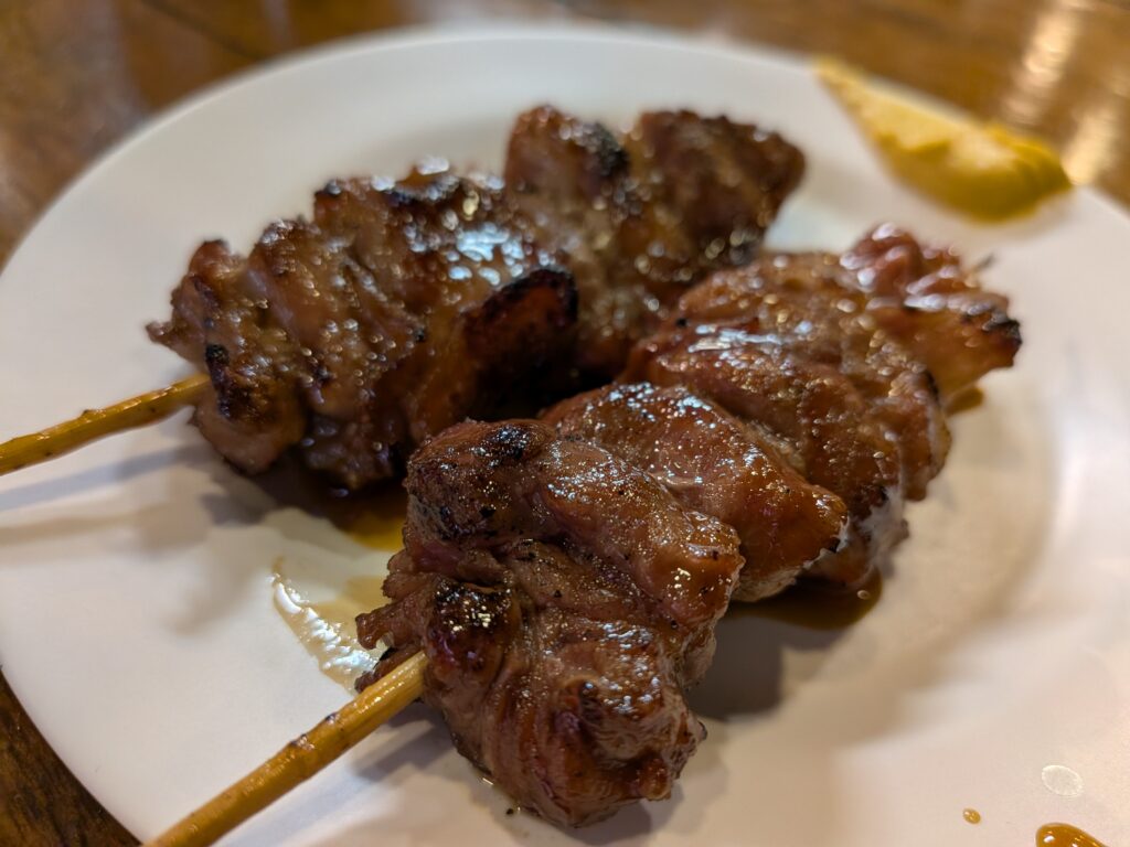 売り切れの串が多く、かしら200円をオーダー。1本200円~、2本縛りで、たれか塩からチョイス。