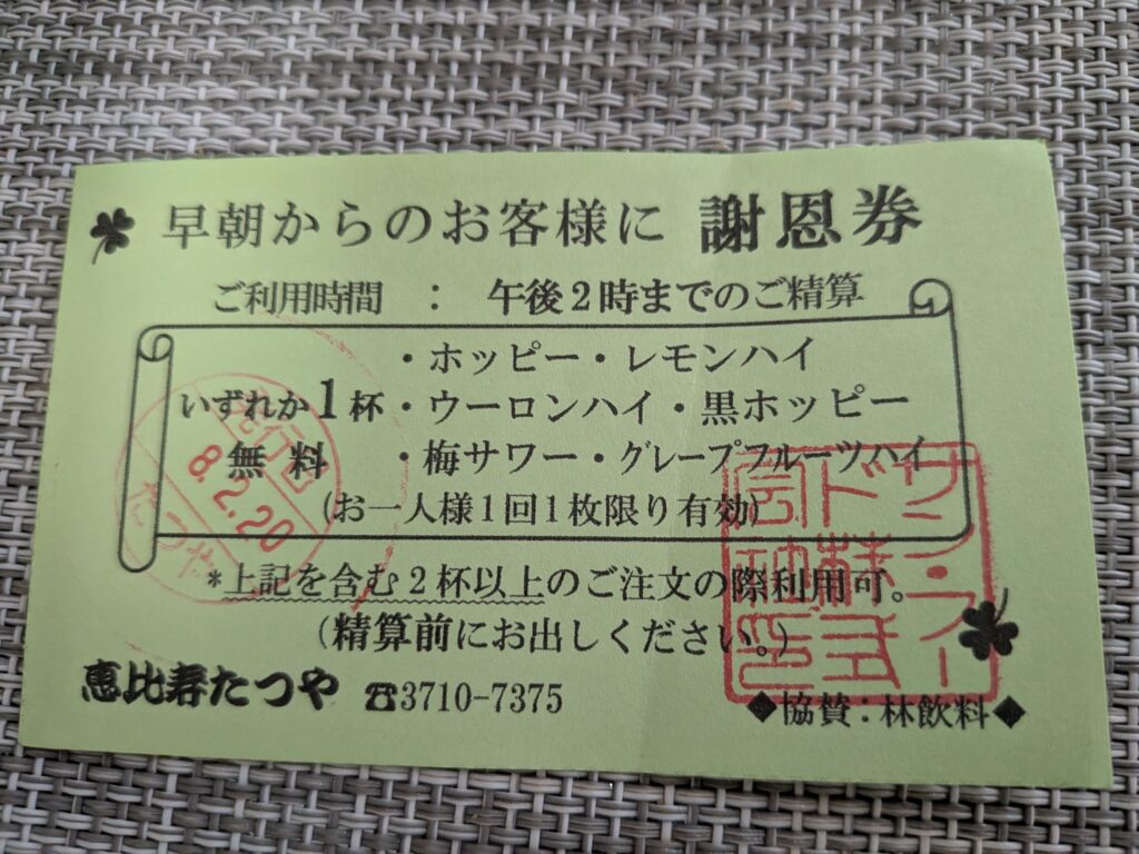 昼飲み(14時までの清算)のお客さんには1杯酒無料券をサービス。※2杯以上飲んだ方になります。