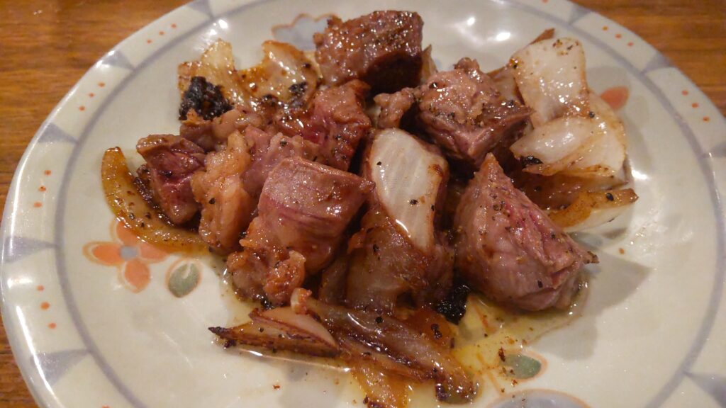 どんどんなくなっていくので、取り急ぎ食べたいものを注文します。人気のハラミみそ炒め550円。はらみと玉ねぎを自家製味噌で炒めた料理です。