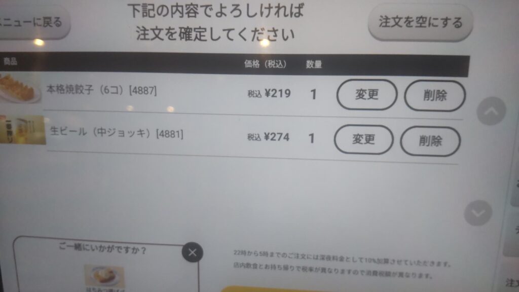 料理は110円引きで餃子219円。餃子のタレも完備!!