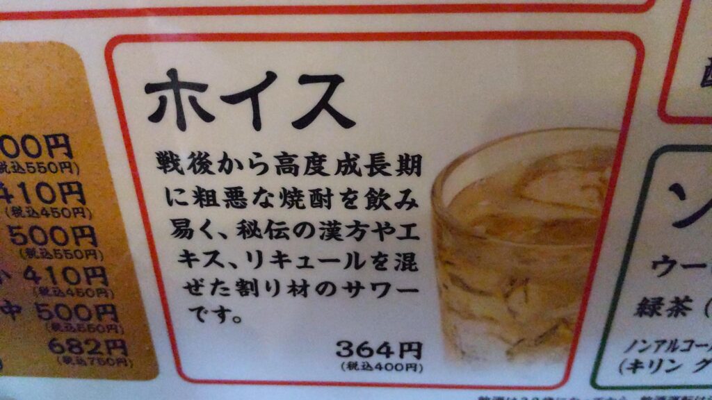 ホイスとは、ウイスキーやビールが高値だった昭和30年代にウイスキー感覚で酔えるようにと作られた割材です。この割材にソーダを加えたお酒がホイス。