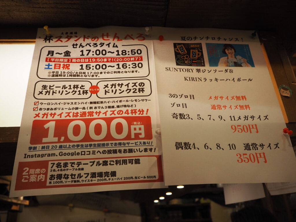 ハイスタでは(時間が改訂されました)開店~19時半、土日祝は~17時半まで、ドリンク2杯&おつまみ1000円のせんべろタイムを実施!サワー類はメガサイズで登場(通常の4杯分)のふとっぱらなんですYO!!