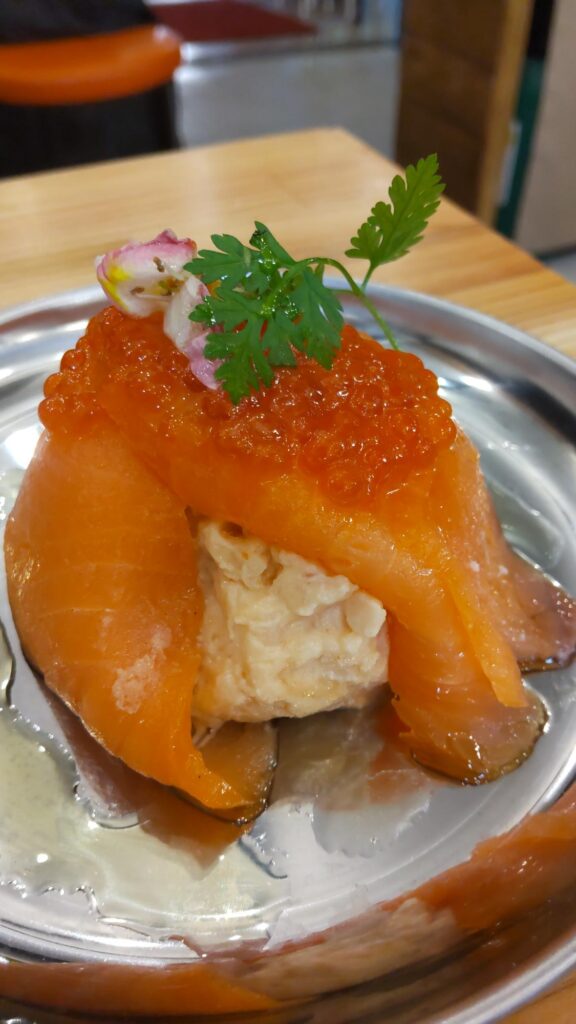 ポテサラ好きなのでとんきぃの「いくらとサーモンのポテトサラダ」2パオをオーダー。クリーミーなポテトとサーモンが合わないわけありません!プチプチしたイクラの食感がアクセント。
