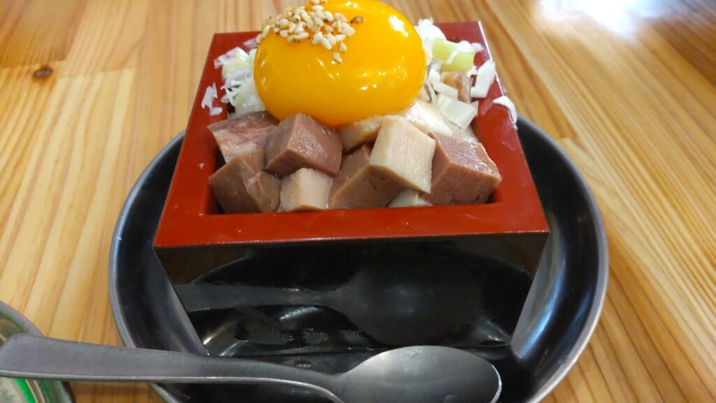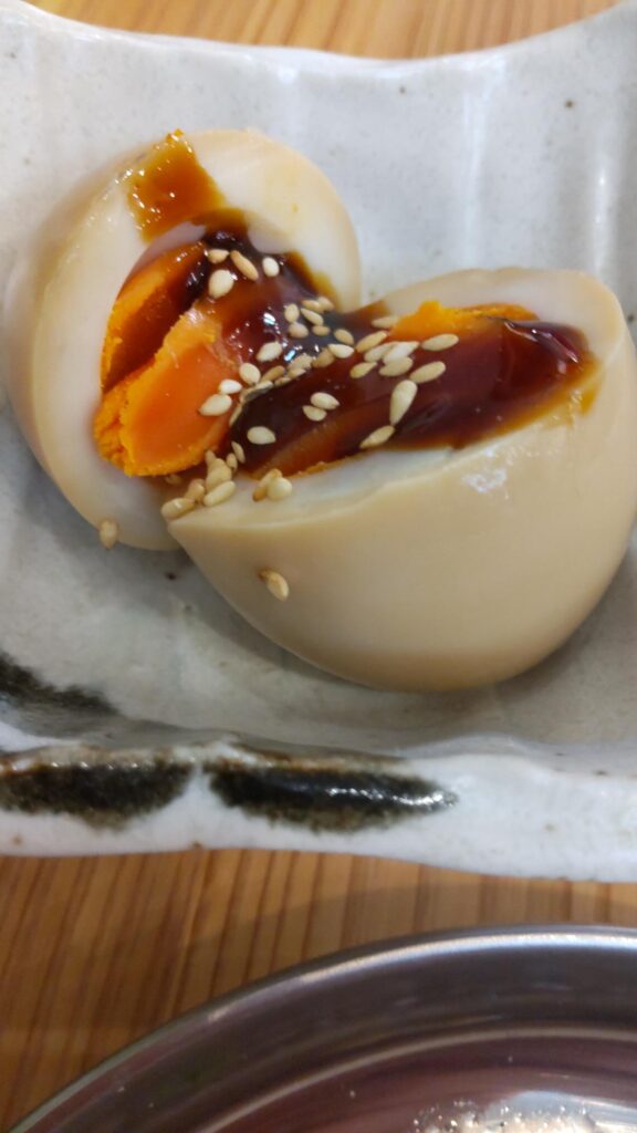ウイスキーで育てた(ネットで調べたところ明確ではありませんでしたが、恐らくウイスキーの製造工程から出た不用な穀物かすか?なぁ)にわとりの玉子料理もあり、煮卵1パオ。