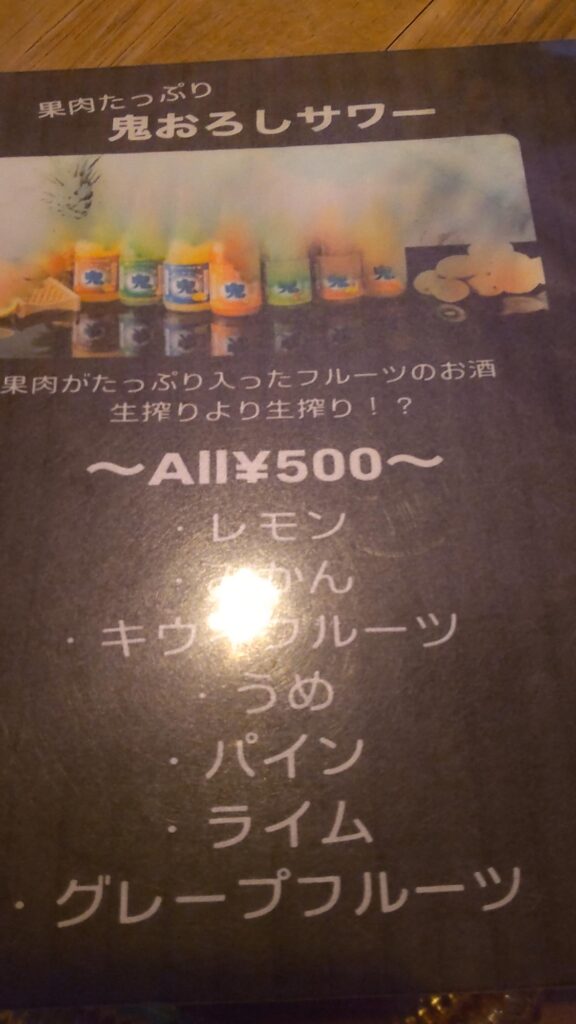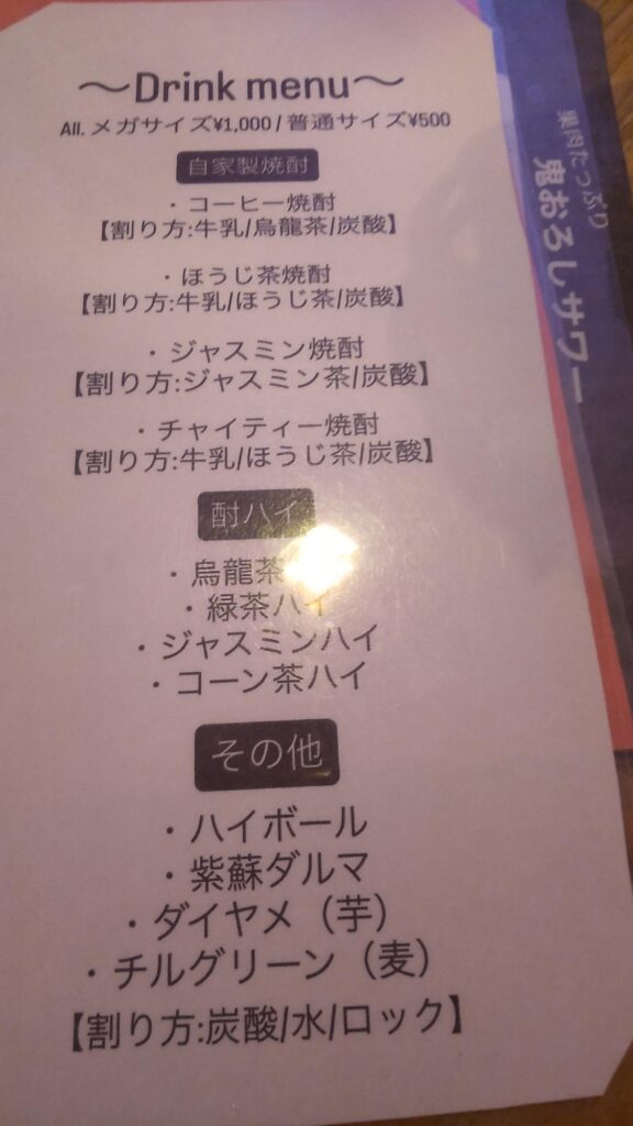 ドリンク500円(メガ1000円)、おつまみ300円均一!