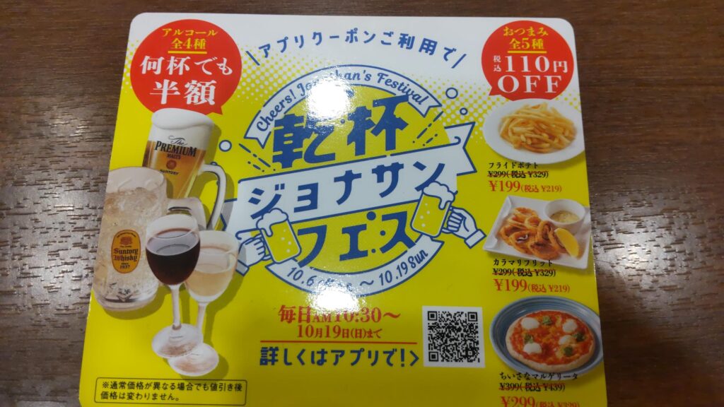 すかいらーくグループの「ジョナサン」。10月19日まで「乾杯フェス」を展開しているとのことで飲みに行ってまいりました(^^♪