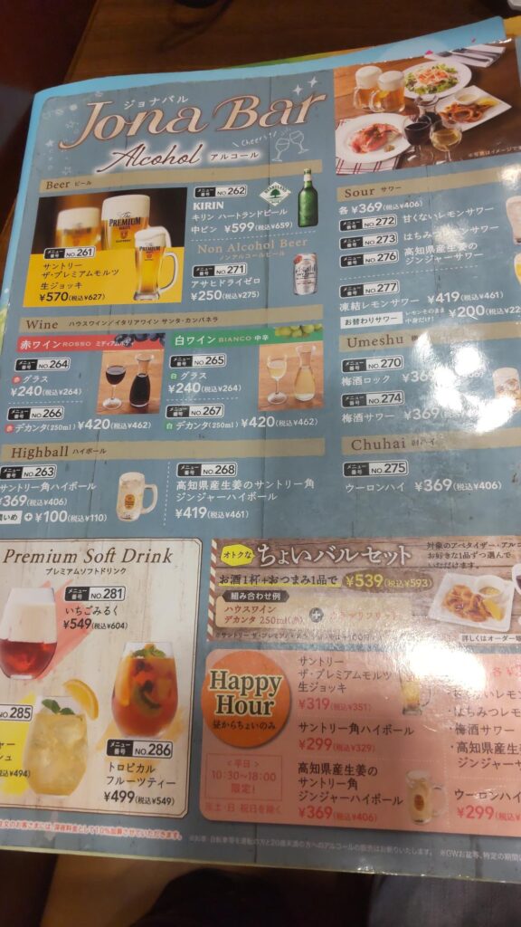 プレモル605ー>301円、ワイン赤・白グラス242ー>121円、デカンタ418ー>209円、角ハイボール384ー>191円の4種が半額に。