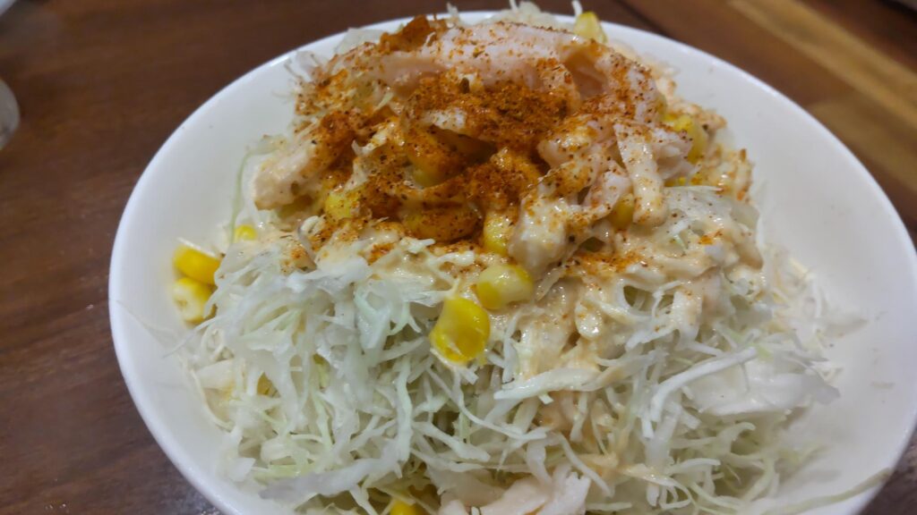 蒸し鶏キャベツサラダ。キャベツてんこ盛りでドレッシングもおいしく~、満足です。