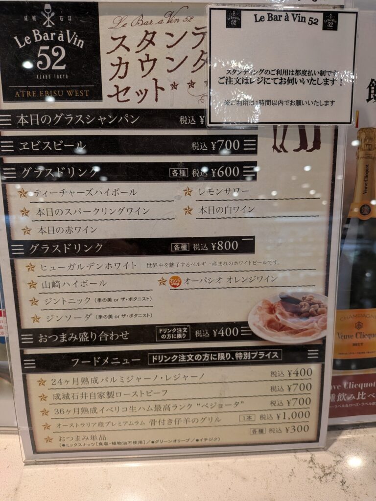 恵比寿駅直結のアトレ4階。成城石井の前とレストランのちょうど中間に立ち飲みがあります!