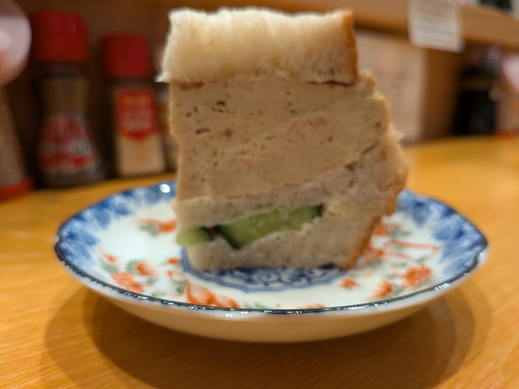 出汁巻き玉子サンド600円。長命うどんさんで人気のかつお節の出汁が利いた厚焼き玉子をアレンジ。きゅうりのほか、パンにも一工夫こらされており、絶妙のハーモニー。おいしすぎました。