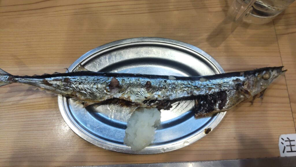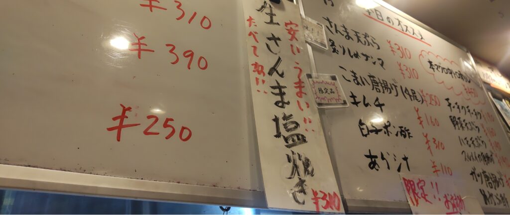 生さんま塩焼き310円の安さ。さんま天ぷら、こまい唐揚げなど、飲兵衛の心鷲掴みのラインナップです(笑)
