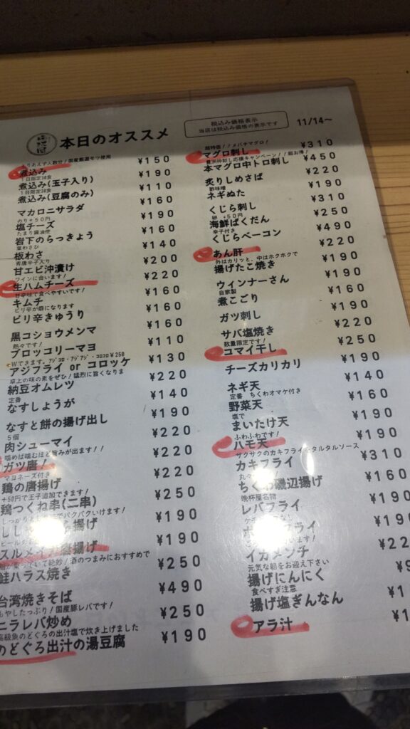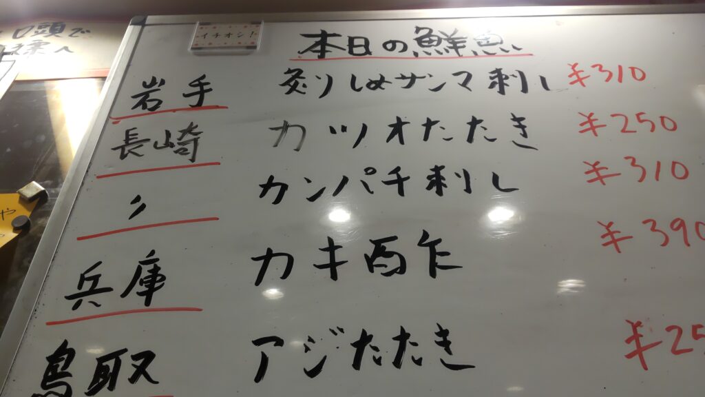 旬の日替わり鮮魚料理がウリで、この日は岩手のサンマ刺し310円、長崎のカツオたたき250円などでした。メニュー数が豊富なので、毎回迷ってしまいます。