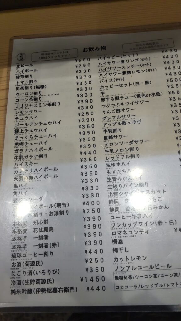 酒は290円~で、ビール、焼酎、生絞り割り、ノンアルなどなどバラエティ豊か。