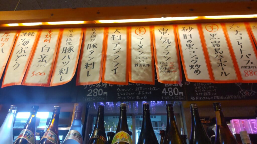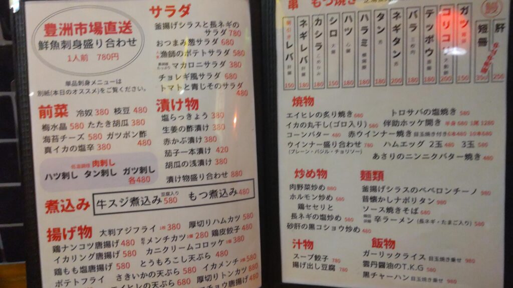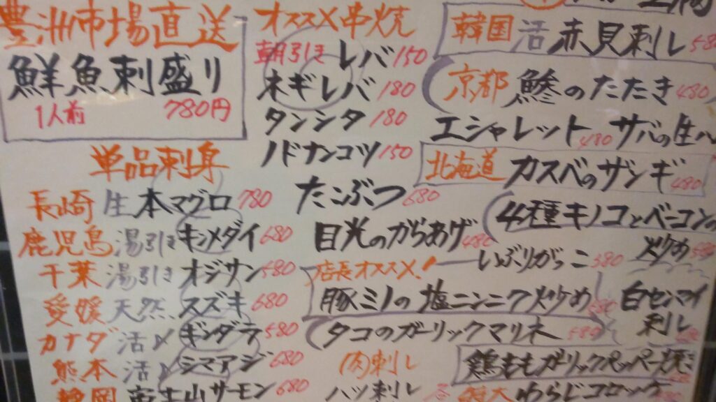 豊洲市場で仕入れた鮮魚がウリで480円~。そのほか串焼き150円~、一品料理も300円~で充実しています。