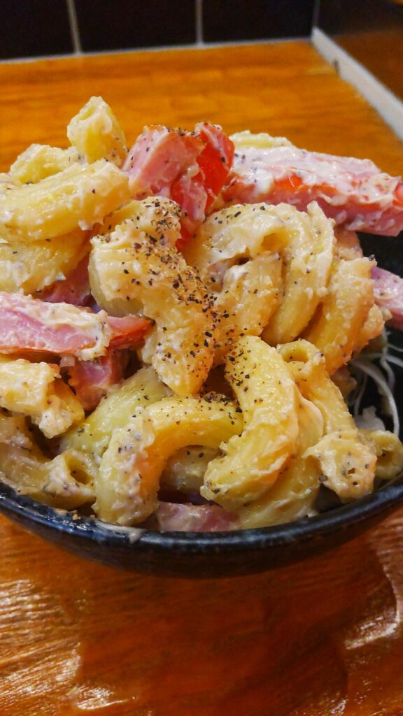 マカロニサラダは、厚切りハムなどてんこ盛りで登場。胡椒や塩がきいていて大人な味わい。