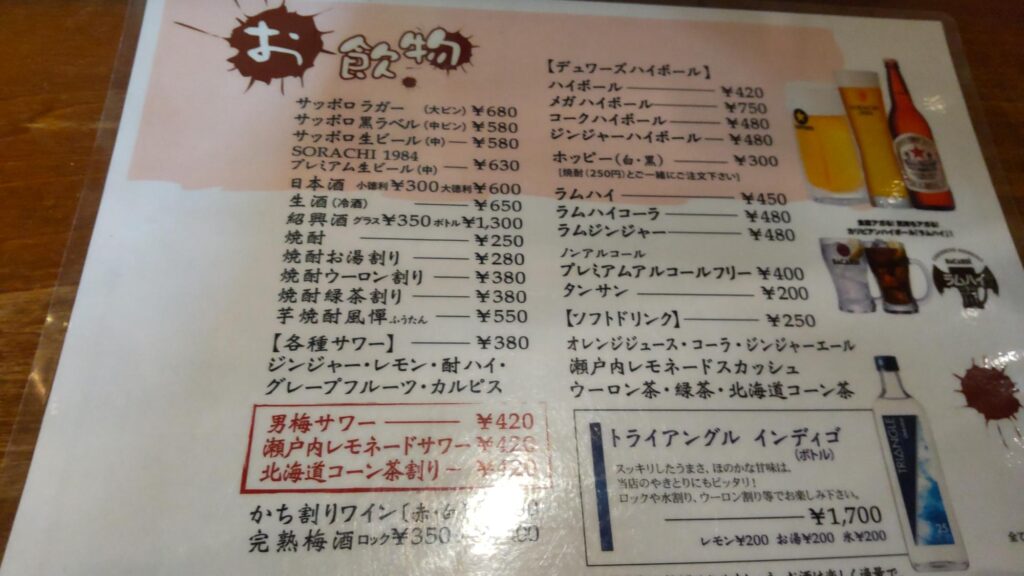 定番メニューは3店共通。ビール、焼酎、日本酒、ホッピー、今や珍しいコークハイなどをそろえています。