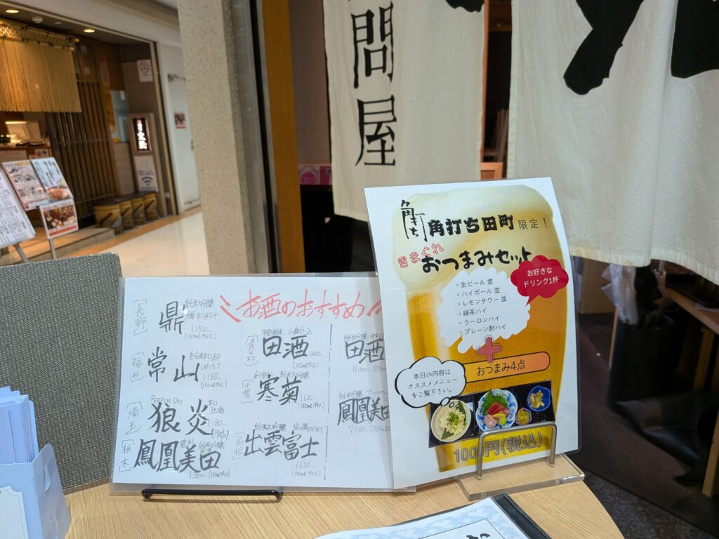 2ウエイの店内・手前の「角打ち田町」では、刺身や小鉢など4品&お酒の超お得な「おつまみセット」1000円を展開しているんです!しかも税込み。