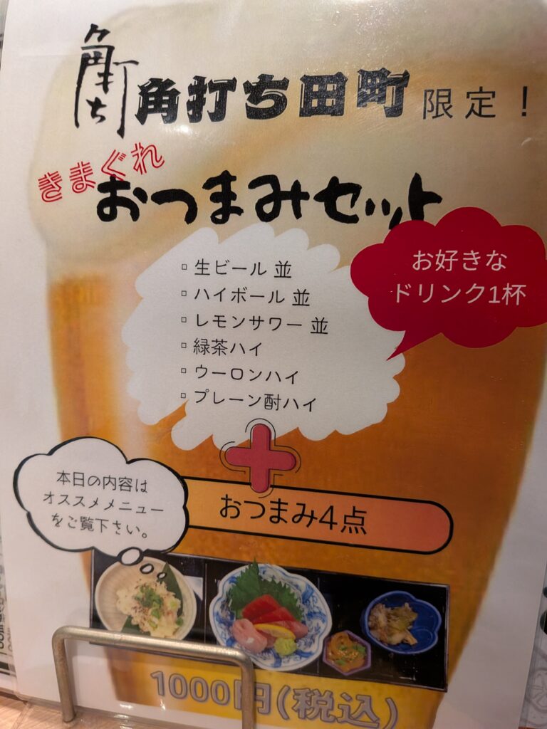 田町・三田 4品&お酒で1000円のおつまみセット「角打ち田町」