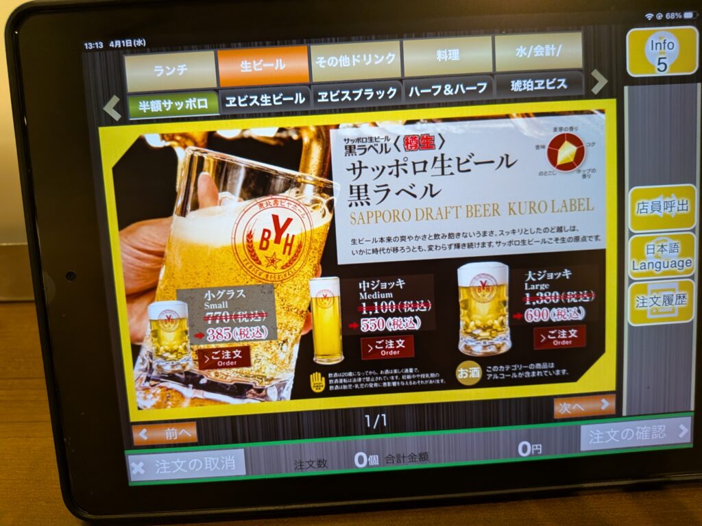 タッチパネルで注文。すでに半額で記載されているのがすごい!