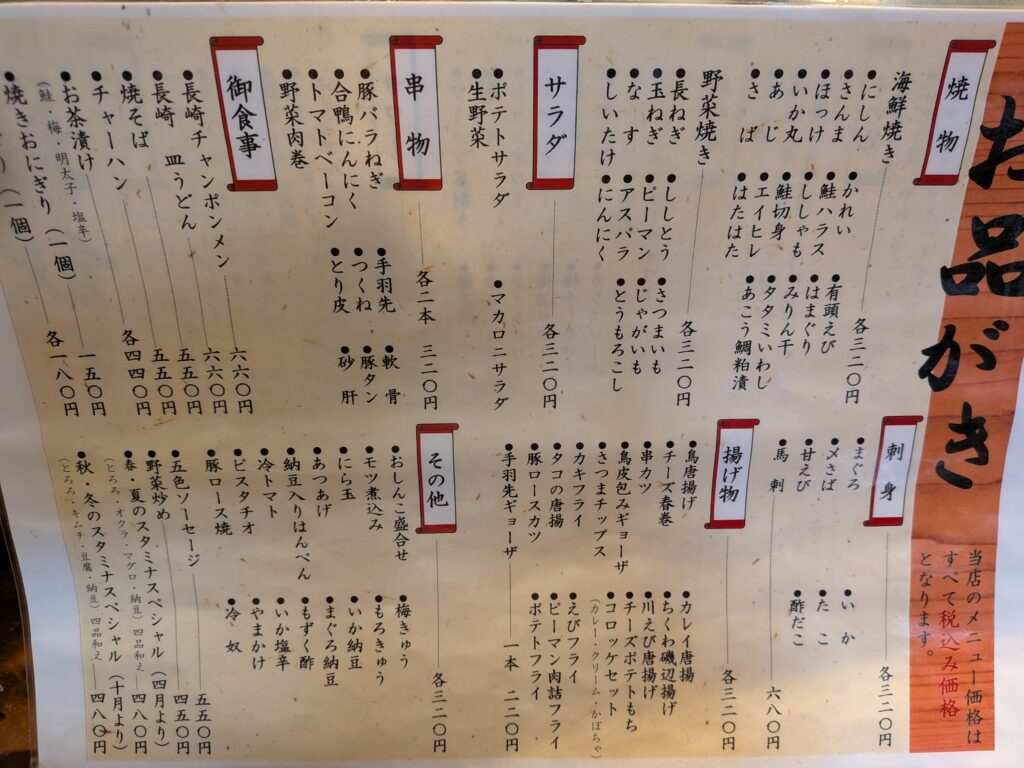 料理も焼き物、サラダ、野菜焼き、串焼き、刺身、揚げ物などなど320円。この安さに後輩もびっくりしておりました!